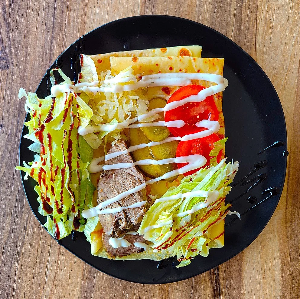 Laktosefreier und glutenfreier Pfannkuchen mit gebackenem Fleisch, Knoblauchsoße und Gemüse