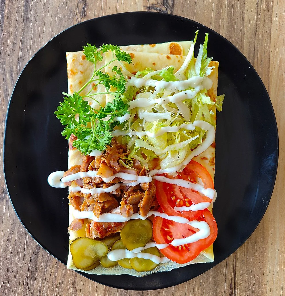 Füllung: Gewürztes gebratenes Hähnchenfleisch, eingelegte Gurke, Eisbergsalat,
